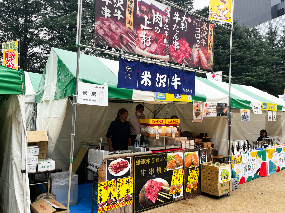 山形「道の駅米沢」ブースでは米沢牛の串焼きを販売