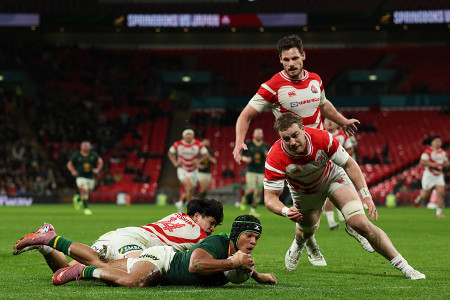 ラグビー日本代表は1日、ロンドンのウェンブリー競技場で南アフリカ代表とのテストマッチに臨み、7―61で大敗した。通算対戦成績は日本の1勝3敗。写真は南アフリカにトライを許した日本。 【AFP時事】