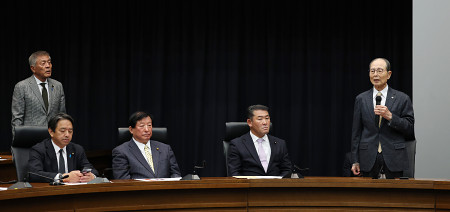野球を通じての地域活性化や健康促進などを目的とした超党派の国会議員による「野球の未来を考える議員連盟」の設立総会が2日、東京都内で行われた。写真は設立総会で発言する王貞治氏(右端)。 【時事通信社】