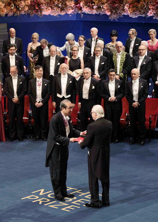 今年のノーベル賞授賞式が10日夕、ストックホルムのコンサートホールで開かれた。写真はスウェーデンのグスタフ国王(手前右)からメダルを授与される、化学賞の京都大・北川進特別教授(同左)。 【時事通信社】