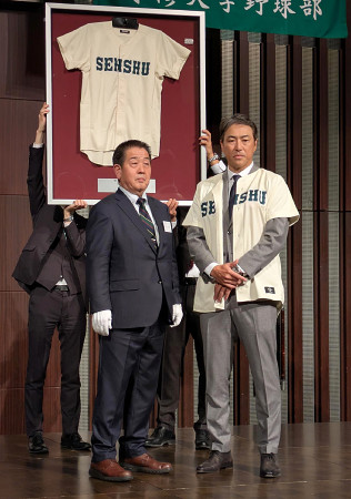専大野球部の創部100周年記念祝賀会が17日、東京都内で開かれ、OBや部員、関係者ら約500人が出席した。写真は、特別功労賞を受賞した黒田博樹さん(右)。 【時事通信社】