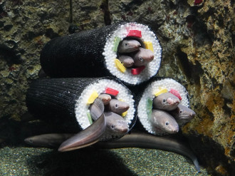 節分にちなんだ「アナゴの恵方巻き水槽」展示が1月17日、仙台うみの杜(もり)水族館(仙台市宮城野区中野4、TEL 022-355-2222)で始まった。