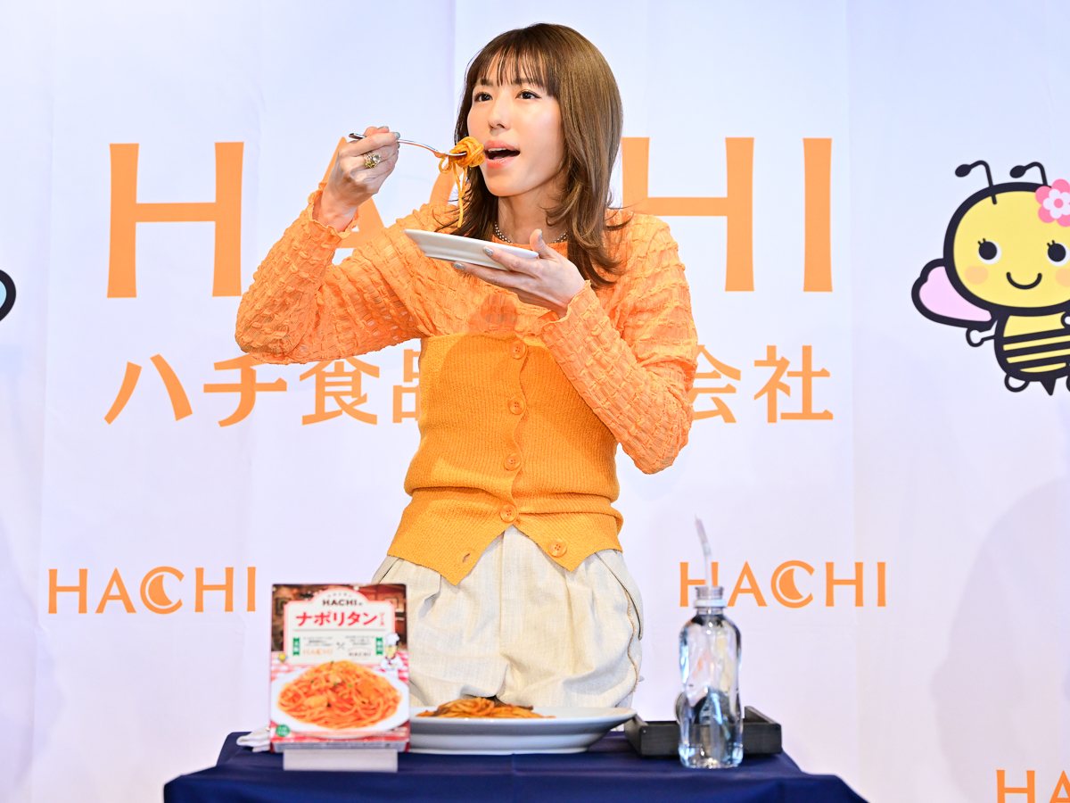 新商品発表会で試食した若槻千夏さん