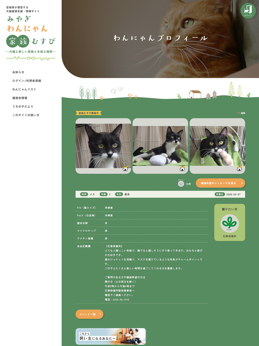 譲渡対象の犬猫の情報を掲載する「わんにゃんプロフィール」