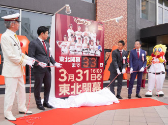 東北楽天ゴールデンイーグルスを運営する楽天野球団(仙台市宮城野区)が2月26日、JR仙台駅2階西口のペデストリアンデッキに開幕カウントダウンボードを設置した。