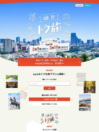 仙台市が2月4日から、1泊最大3,000円引きとなる宿泊促進キャンペーン「仙台トク旅〈第2期〉」の予約を受け付けている。