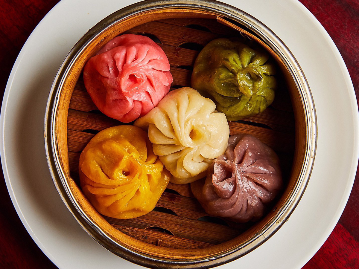エビ、豚肉、フカヒレ、鶏肉、牛肉の5種類のショーロンポー「五色小籠包」