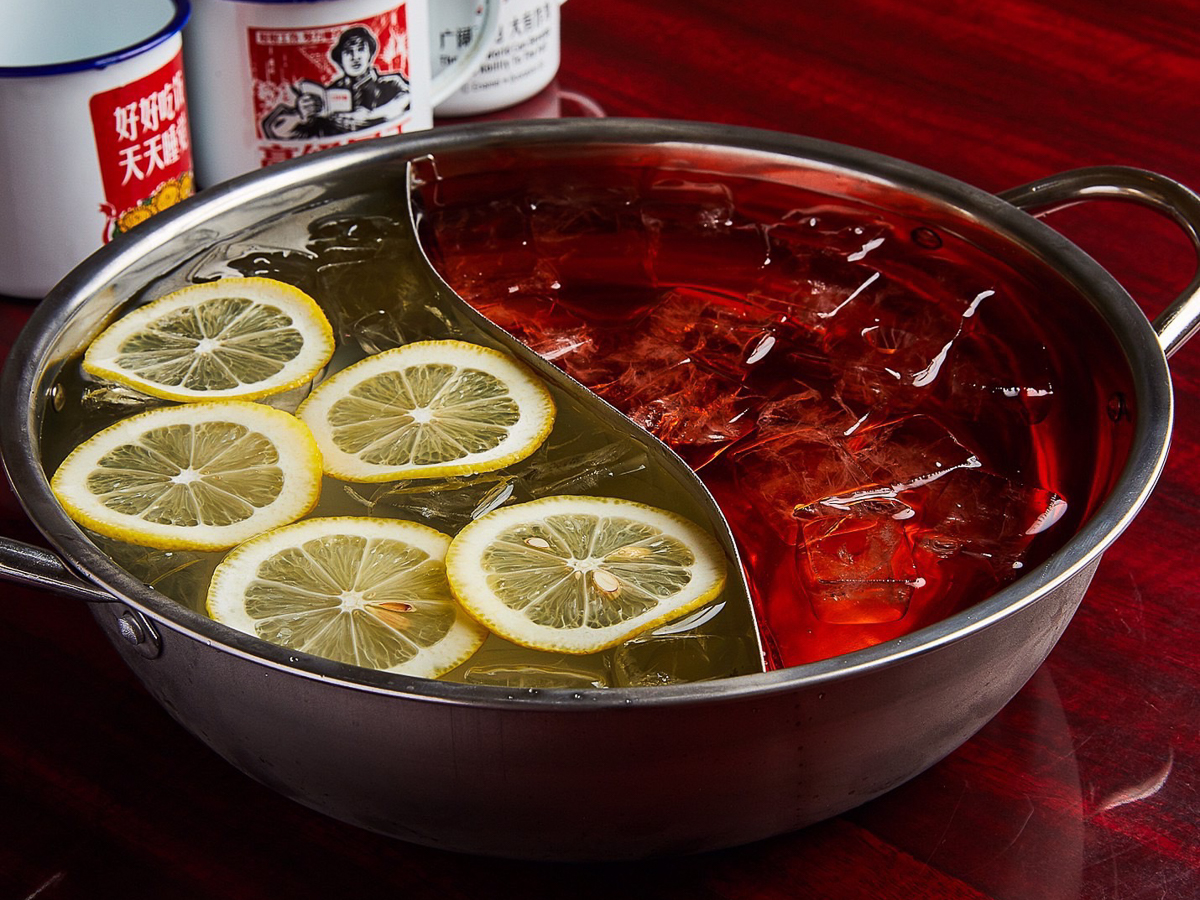 2色鍋に入れた2種類のサワーをお玉ですくって飲む「火鍋サワー」