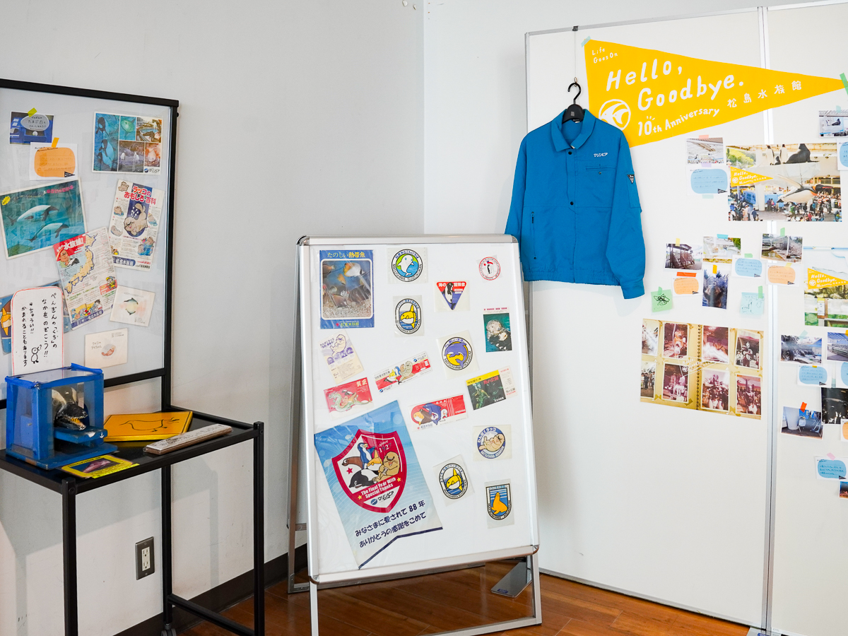 松島水族館のチケットやチラシ、スタッフユニホームの展示