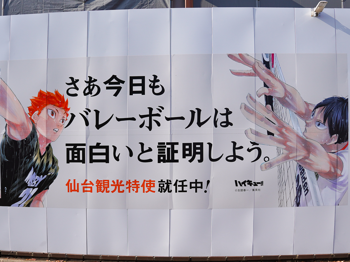 大規模改修工事中の「仙台市体育館(カメイアリーナ仙台)」(仙台市太白区富沢1)東側仮囲いに現在、仙台ゆかりのスポーツ漫画「ハイキュー!!」のイラストが掲出されている。