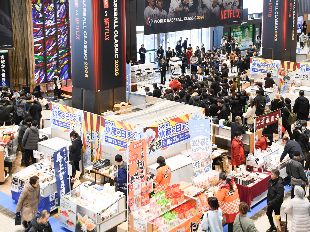 「みやぎ水産の日まつり」が2月18日、JR仙台駅2階ステンドグラス前で始まった。