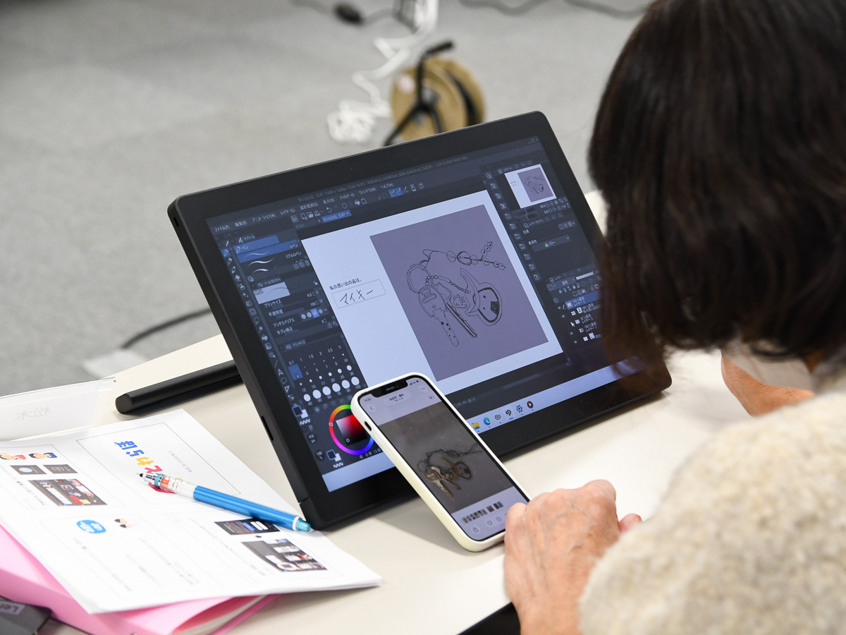 スマートフォンで撮影した写真を見ながら絵を描く