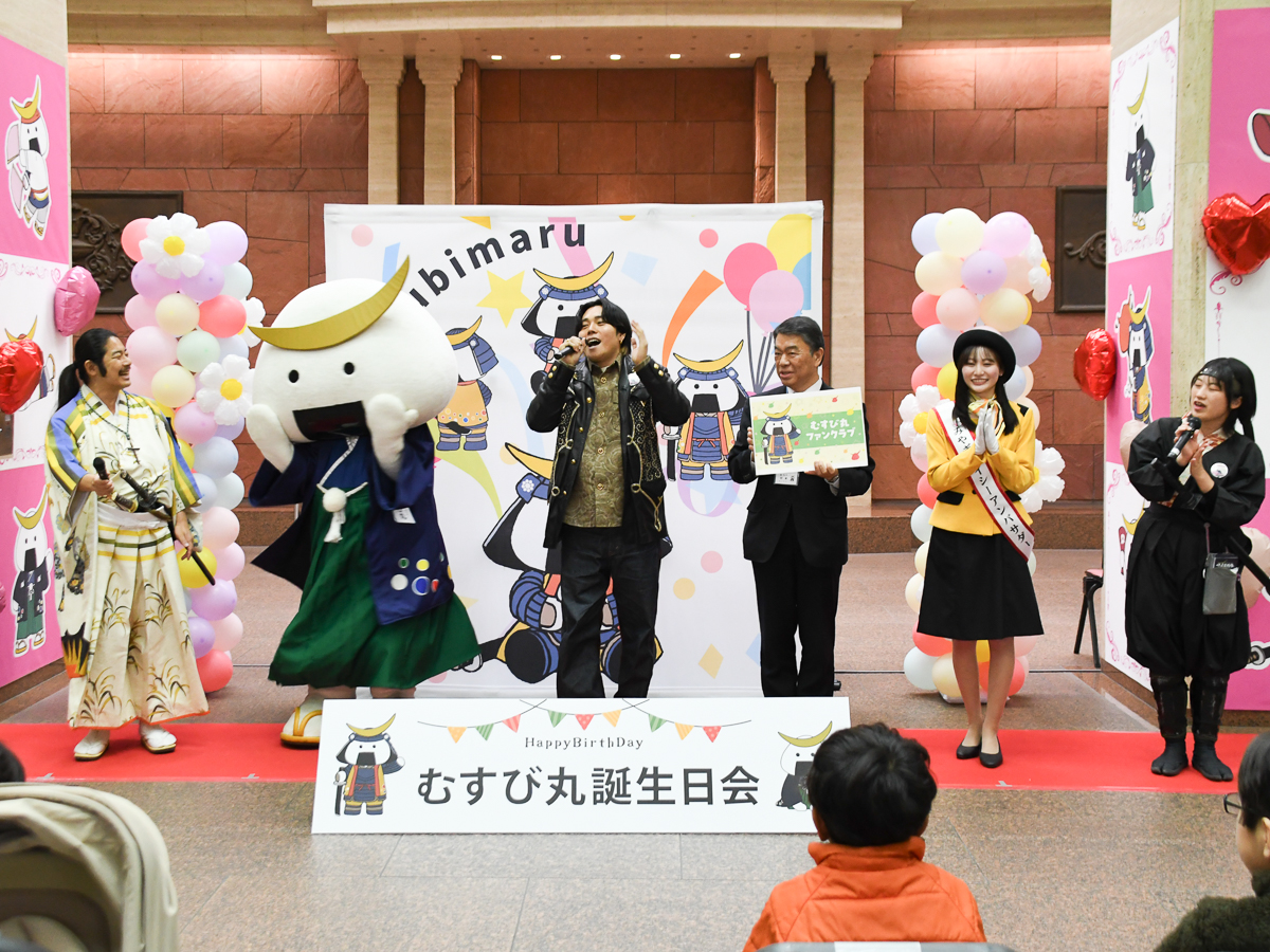 仙台・宮城観光PRキャラクター「むすび丸」の誕生日会が3月9日、宮城県庁1階県民ロビーで開かれ、併せて公式ファンクラブ設立が発表された。