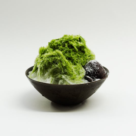 「霜塩小餅」を器にあしらい、ふわりと柔らかい口溶けの氷と玉澤オリジナル抹茶ソースを二層に重ねました。宇治抹茶や砂糖などをミルクで煮込んで作る「玉澤オリジナル抹茶ソース」は、優しい甘さと風雅な香りが特徴です。霜塩が引き立てる、新しい氷甘味の味わいと口溶けをお楽しみ下さい。