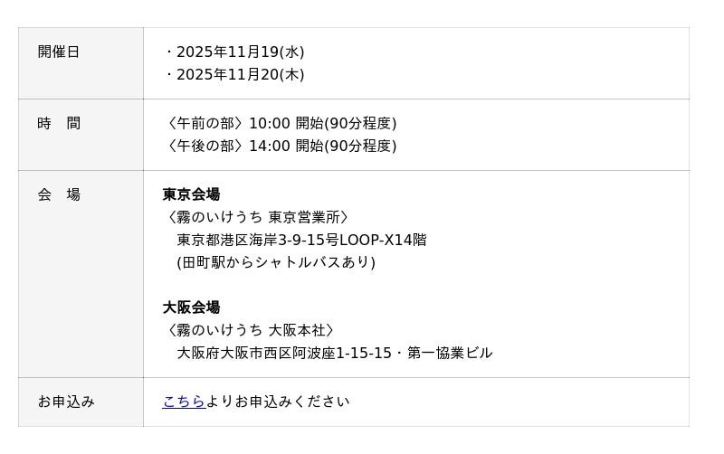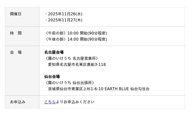 株式会社いけうち(霧のいけうち、本社:大阪府大阪市西区)は、令和7年11月より全国5拠点(東京・大阪・名古屋・福岡・仙台)において、産業用ドライフォグ加湿システム体験会を開催いたします。