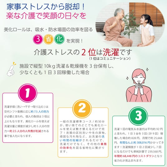 3.介護現場ストレス第2位の洗濯の手間による人件費、業務の効率化、コストダウンなどの省略化が見込まれます
