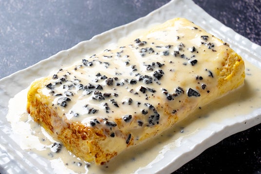 黒トリュフが入ったチーズソースをたっぷりかけた、贅沢な玉子焼き。とろけるチーズとトリュフの香りが食欲をそそります。