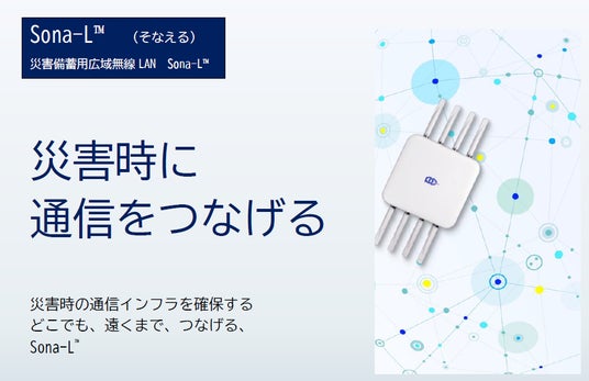 大規模災害時に既存の通信インフラが途絶える課題を解決するために開発され、通信知識がなくても約15分でインターネット環境を確立できる「災害備蓄用広域無線LANシステム Sona L(TM)」の紹介展示を行います。
