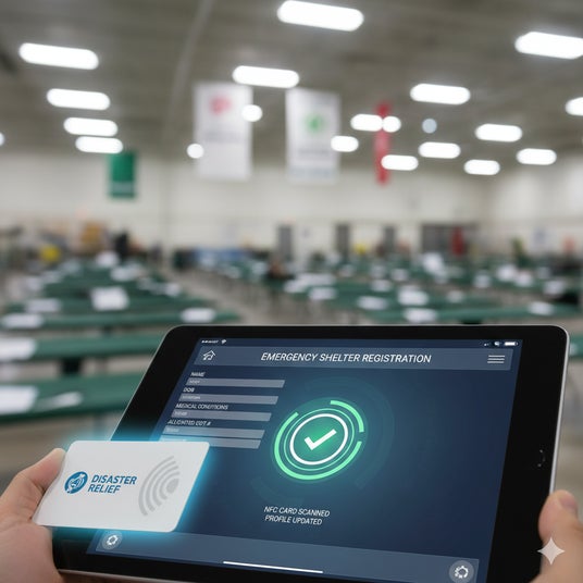 現在の避難所受付管理は紙の受付表への記入が主流です。この新ソリューションではNFCカードを活用することで、避難者情報や安否、物資配布をデジタル管理するとこができます。中央情報大学校の学生が発案したもので、会場ではクイズ形式で疑似体験することができます。