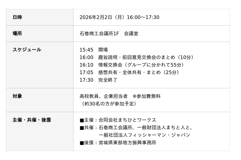 こうした課題の解消に向け、一般財団法人まちと人と(代表理事:斉藤誠太郎)は「合同会社まちひとワークス(代表社員:松本裕也)」と共催で、高校教員と企業担当者が直接対話する「高校と企業の『リアル』をつなぐ情報交換会」を開催します。