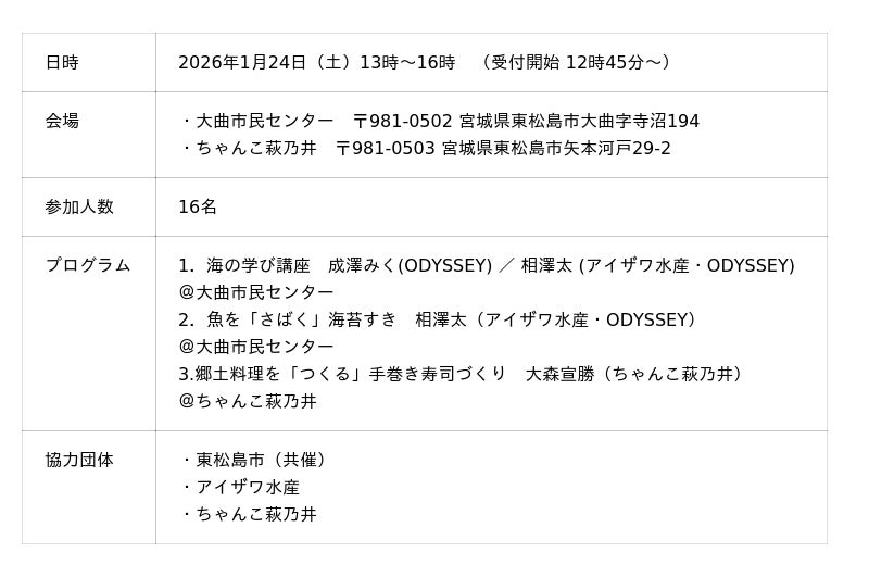 一般社団法人 海のごちそう推進機構と一般社団法人ODYSSEYは、東松島市の特産品である海苔を作る海苔すき体験、地域の海洋変化や海藻について学ぶこと、さらに地域の郷土料理に根差した調理体験など、日本の豊かな海の食文化を継承し輪を広げる取組み(第二回)「日本さばける塾 in 東松島」を1月24日(土)に開催しました。