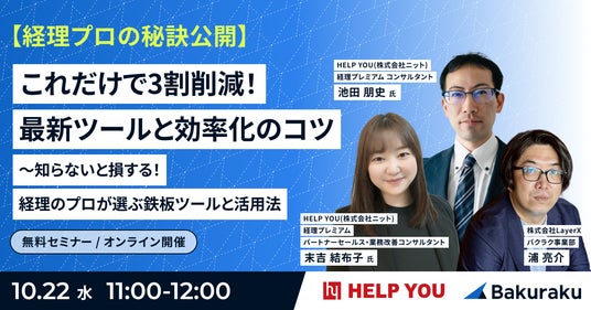 本セミナーでは、HELP YOUの経理専門チームが、実務で効果を発揮する最新ツール「バクラク」を徹底解説。導入による改善事例や成功のステップをわかりやすく紹介します。
