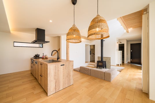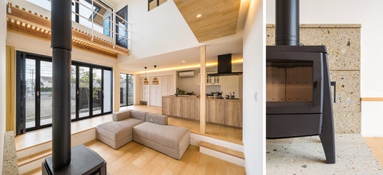 東北の厳しい冬でも家中が暖まるよう、家の中心に薪ストーブを設け、家族が集う暮らしをデザイン