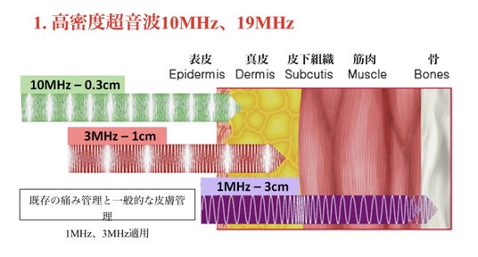 1つのブローべから最大4つの周波数を高速で切り替えることで、肌の深部に振動エネルギーを届け、細胞の再生と修復を促す医療用高密度超音波機器です。