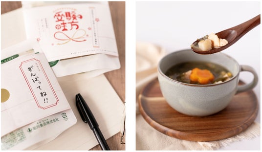 「受験の味方」は、夜遅くまで頑張る受験生に向けて、レンジアップで手軽に食べられるスープです。身体を温め、免疫力や集中力を高めると言われる素材を組み合わせ、心身両面から受験期を支えます。「縁起 × 美味しさ × 健康」を融合した、冬季・受験期限定の応援スープです。