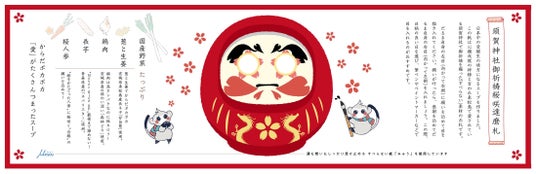 デザインは、東松島市のカクテルデザイン上野氏のアイディアによるもので、表面には須賀神社の龍をモチーフにした熨斗(のし)、裏面には達磨札を配置しました。