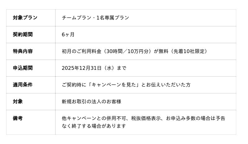 10周年の節目に、より多くの企業さまにその価値を実感いただくため、「10周年記念ありがとうキャンペーン」を実施いたします。本キャンペーンでは、先着10社限定で、通常月額10万円(30時間分)を初月無料でご利用いただけます。