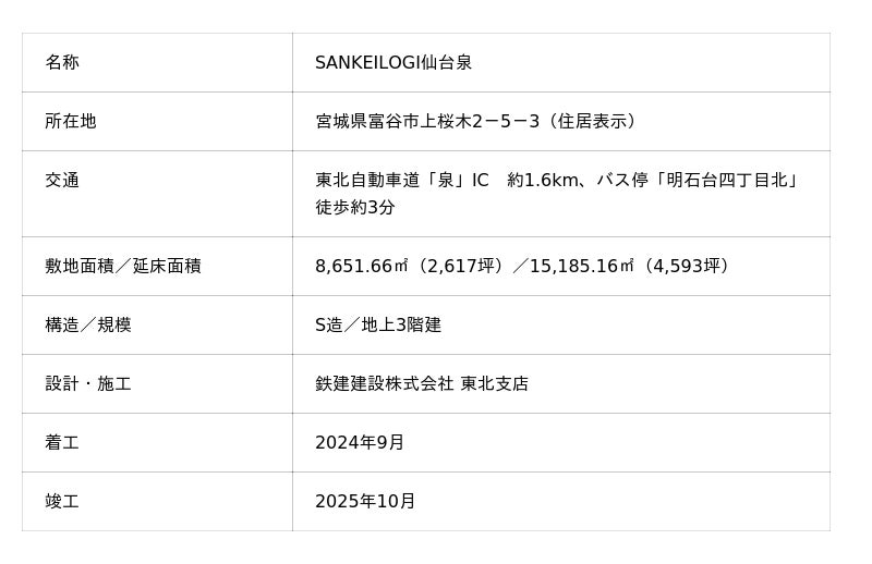 株式会社サンケイビル(本社:東京都千代田区大手町、代表取締役社長:飯島一暢、以下「当社」いう)は、宮城県富谷市において「SANKEILOGI仙台泉」(以下「本物件」という)が2025年10月31日(金)に竣工いたしますので、お知らせいたします。
