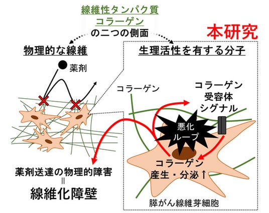 - 線維化組織中のコラーゲンは薬剤送達を物理的に妨害すると考えられていましたが、本研究では初めてコラーゲンの生理活性の寄与を明らかにしました。