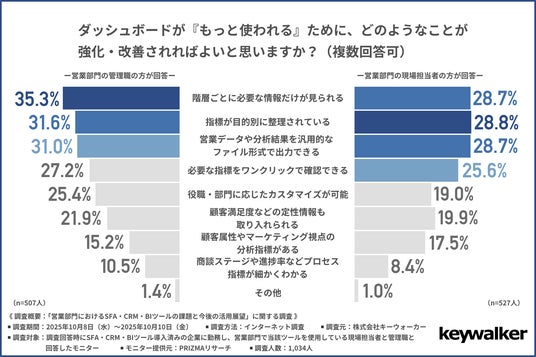 最後に「ダッシュボードが『もっと使われる』ために、どのようなことが強化・改善されればよいと思うか」について尋ねたところ、営業部門の管理職と現場担当者で以下のような回答結果になりました。