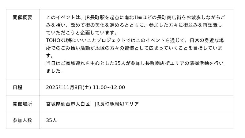 一般社団法人TOHOKU海にいいことプロジェクト(宮城海ごみなくし隊)は、2025年11月8日(土)に生活の中での街のごみ拾い活動の習慣化を目的として、「まち歩きdeごみ拾い」を開催いたしました。
