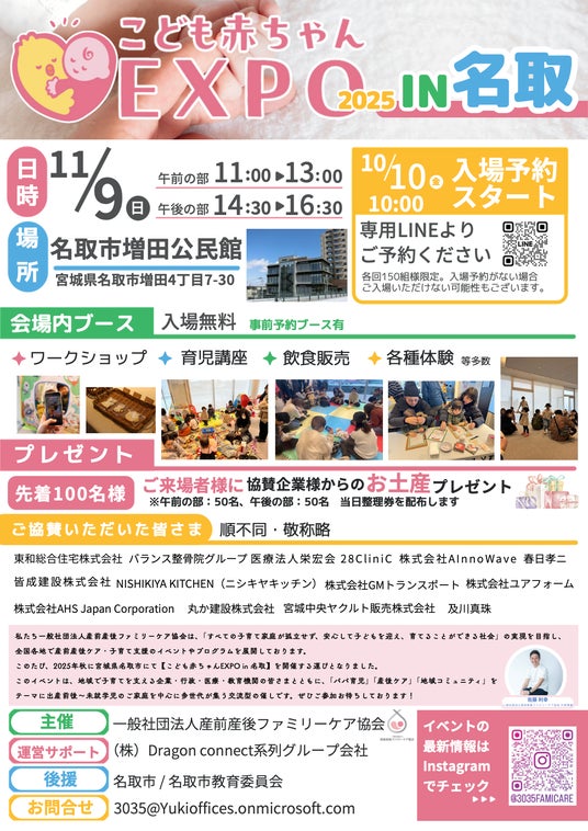非営利にて子育てファミリー向けイベントを開催する一般社団法人産前産後ファミリーケア協会(本社:宮城県仙台市、代表理事:佐藤利幸)は、2025年11月9日(日)に宮城県名取市の増田公民館にて、「こども赤ちゃんEXPO 2025 in名取」を開催。午前・午後の2部制で行われた本イベントには、合計約330名(大人178名、子ども164名)のファミリーが来場しました。地域の企業や団体、学生ボランティアが協力し、親子で楽しめる体験や交流を通じて地域とつながるイベントとなりました。