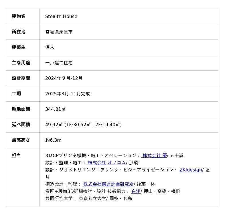 2025年11月7日、株式会社 築(KIZUKI)、株式会社 ONOCOMは、宮城県栗原市にて日本初となる2階建て3Dプリンター住宅の建設を完了。建設・材料・機械・技術など、国内外20社以上の協賛・協力企業が技術を結集して実現しました。