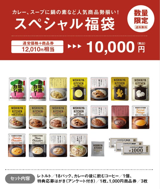 スペシャル福袋 10,000円(税込)カレーやスープ、鍋の素など、いろいろな商品を楽しみたい人におすすめ!レトルトが18パックと3,000円分の商品券が入ったセット