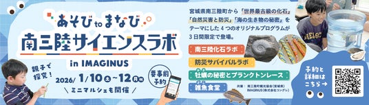 一般社団法人南三陸町観光協会は2026年1月10日(土)~12日(月・祝)に東京都杉並区の科学体験施設IMAGINUS、NPO法人海の自然史研究所とのコラボレーションイベントを開催します。南三陸の自然や生き物・環境などをテーマにした4つのオリジナルプログラムを展開し、親子で“科学と暮らしのつながり”を楽しみながら学べる内容です。12月1日よりIMAGINUS公式サイトにて予約を開始しました。