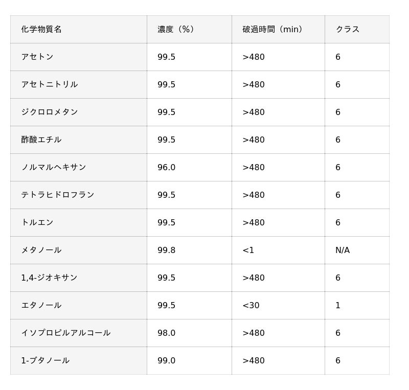 ※破過時間はケミカルグローブ CG100に使用される材質での測定値であり、保証値ではありません。