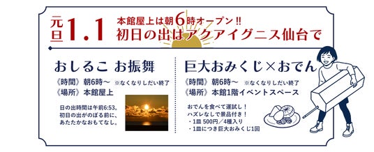 アクアイグニス仙台(仙台市若林区藤塚/運営:仙台reborn株式会社)は年末年始も休まず営業いたします。元旦からは新春フェアとして「初日の出」営業、豪華景品が当たる「新春ガチャ」や初売りを開催いたします。年末年始はご家族そろってアクアイグニス仙台へ。最高の新年を迎えましょう!