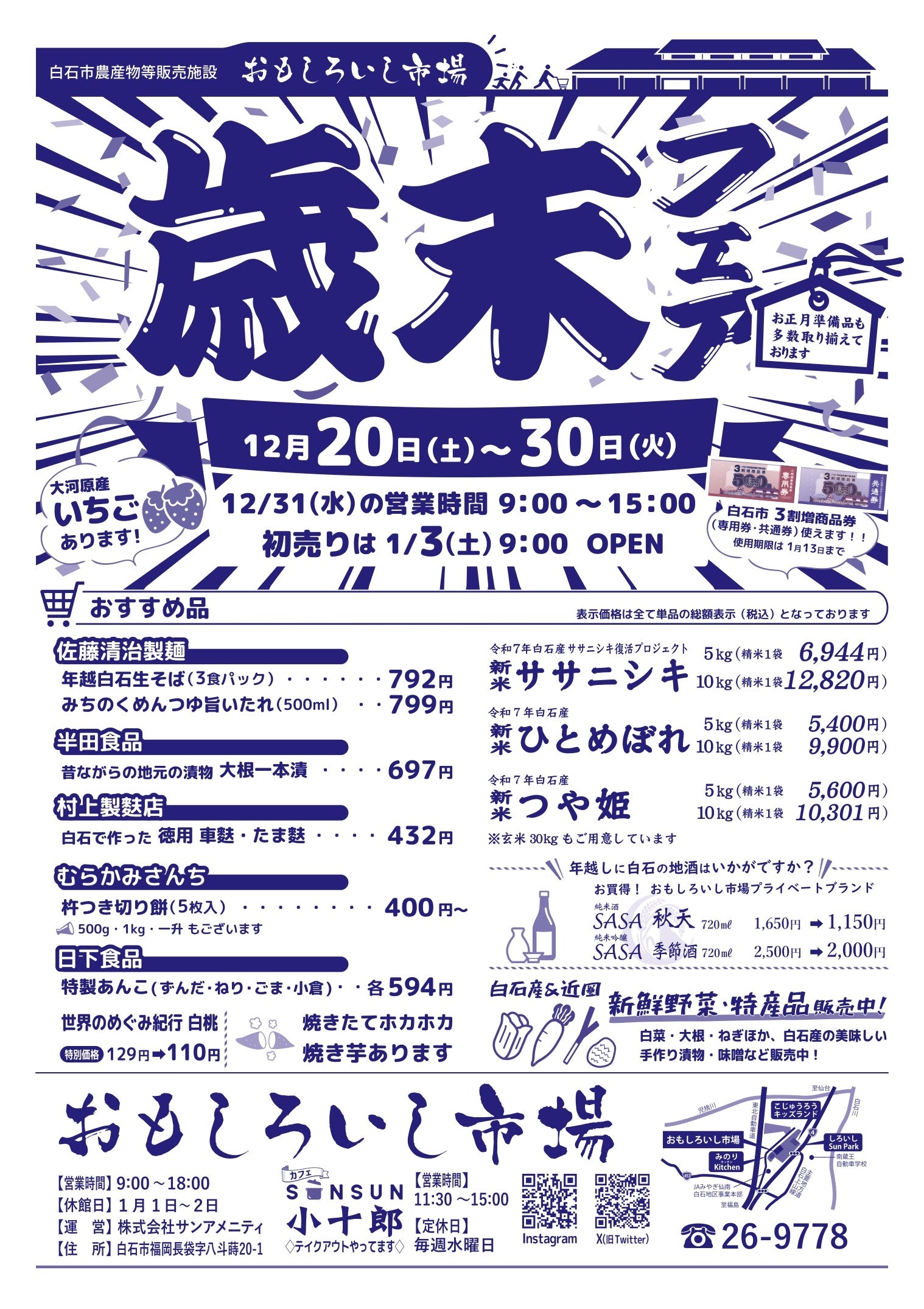 正月準備品を始め、大河原町直送のいちごを販売、宮城白石産ササニシキ原料に地元白石の酒蔵「蔵王酒造」で醸造したおもしろいし市場オリジナル日本酒SASAシリーズを大特価で販売します。