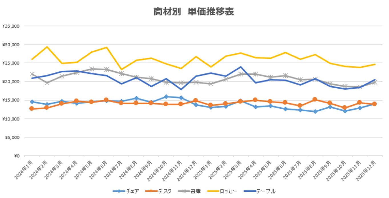 株式会社オフィスバスターズ(東京都千代田区、代表取締役社長:熊谷 正慶<東京証券取引所 TOKYO PRO Market 証券コード:5890>、以下「当社」)は、2025年12月度の「中古オフィス家具指数」を取りまとめました。12月は年末の入替需要の高まりを受け、主要5商材の平均単価が前月比で上昇しました。都心の空室率が2.22%まで低下する一方、有効求人倍率は1.18倍、失業率は2.6%と横ばいで推移しており、雇用環境は安定的に推移しています。こうした環境下で、移転を伴う大型案件は慎重姿勢が強まり、移転ではなく既存オフィスのレイアウト変更や部分入替による対応が増加しました。