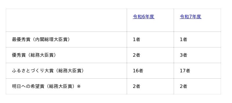 長い歴史の中で賞の構成は時代に即して変化してきましたが、昨年度・今年度は以下表のとおりとなります。本賞の特性上、受賞者は地方自治体・団体・個人となるため、単位は今年度より「者」に統一されました。