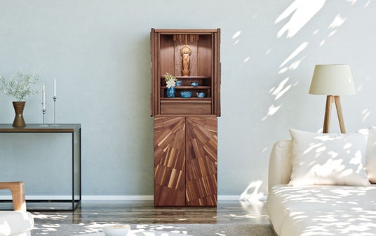 故人の生きた証を輝かしく照らし、最高のかたちで供養したい。「ヘリオス」は、そうした想いに応えるハイモダンなデザインのお仏壇です。感謝を表す場所にふさわしいものを目指し、希少なウォールナットの無垢材で、光の輝きを想わせる壮麗な造形を実現しました。モダンインテリアに調和しながらも、お仏壇としての力強い存在感を放ちます。