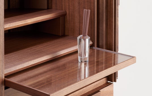 「ヘリオス」は、現代仏壇のデザインと日本の木工技術が融合して生まれたお仏壇です。製造を手掛けているのは、鳥取県に工場を構える家具メーカー、株式会社新木コーポレーション。昭和7年の創業以来、高級婚礼家具の製造で培った高い技術を活かし、オリジナル製品をはじめ、オーダー家具や官公庁などの特注品も手掛ける、まさにものづくりのエキスパート。今回、これまでにない唯一無二のデザインを実現したいという開発者の想いに応え、細部までこだわり抜いて「ヘリオス」を作り上げました。上質な仕上がりはもちろん、可動部のスムーズな動きや、触れた時の滑らかな手触りも、すべて匠の丁寧な手仕事によるものです。