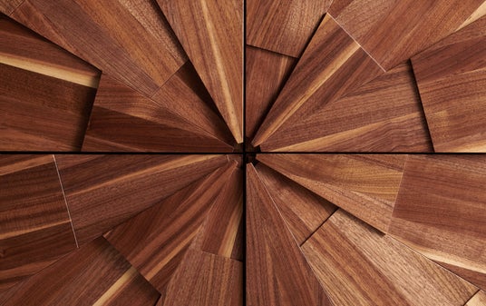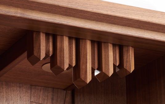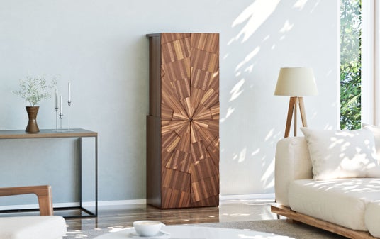 最大の特長は、扉の中心から木目が放射状に広がるデザインです。職人が無垢材の木目を見極めながら厚さの異なる部材を一つひとつ作り出し、時間をかけてパズルのように繋ぎ合わせることで、光線が広がる様子を立体的に表現しました。同じ木目の扉は一つとしてなく、無垢材ならではの個性が際立ちます。