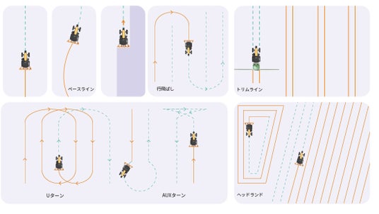 AT2 Max は、直線や曲線だけではなく、A+ラインやトリムラインなど、さまざまな種類のベースラインを備えています。圃場の形状や作業内容に合わせて選べるので、効率よく作業を進められます。また、自動旋回機能を活用することで、操作距離を最大30%削減(手動操作時と比較)し、燃料も節約できます。