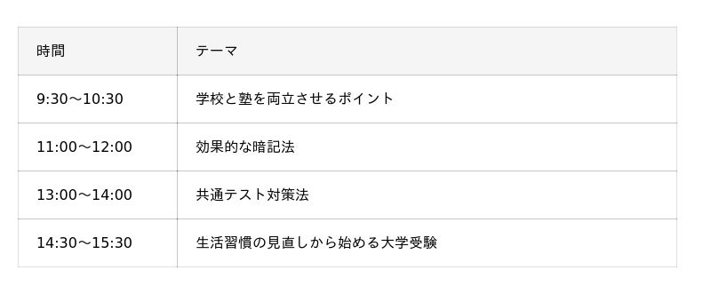新しい学年が始まった4月は、学習習慣を身に着ける絶好の機会です。4月11日に開催する「学習ガイダンス」では、わかっているようで実はわかっていない学習法などについてわかりやすくアドバイスします。また、4月12日に行う「現役合格セミナー」では、難関大学の今春の入試問題を分析し、現役合格するための準備や心構えと、今から何をするべきか説明します。