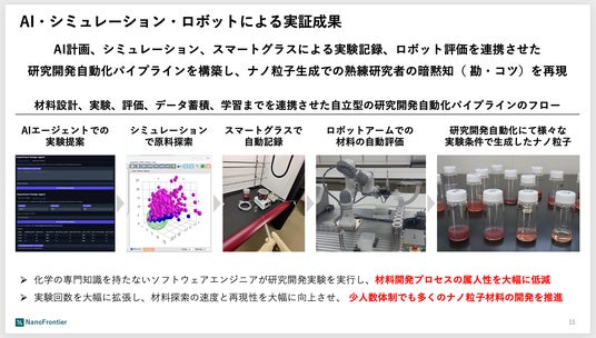 当社は、AIエージェントによる実験提案・シミュレーションによる原料探索・スマートグラスでの自動記録・ロボットアームによる材料評価を一連のパイプラインとして連携させ、ナノ粒子生成における熟練研究者の暗黙知(勘・コツ)をAIで再現する研究開発自動化システムを構築しました。さらにテーマ探索から補助金探索・特許作成・潜在顧客探索まで、研究開発に付随するすべての業務をAIが担う統合パイプラインへと発展させています。